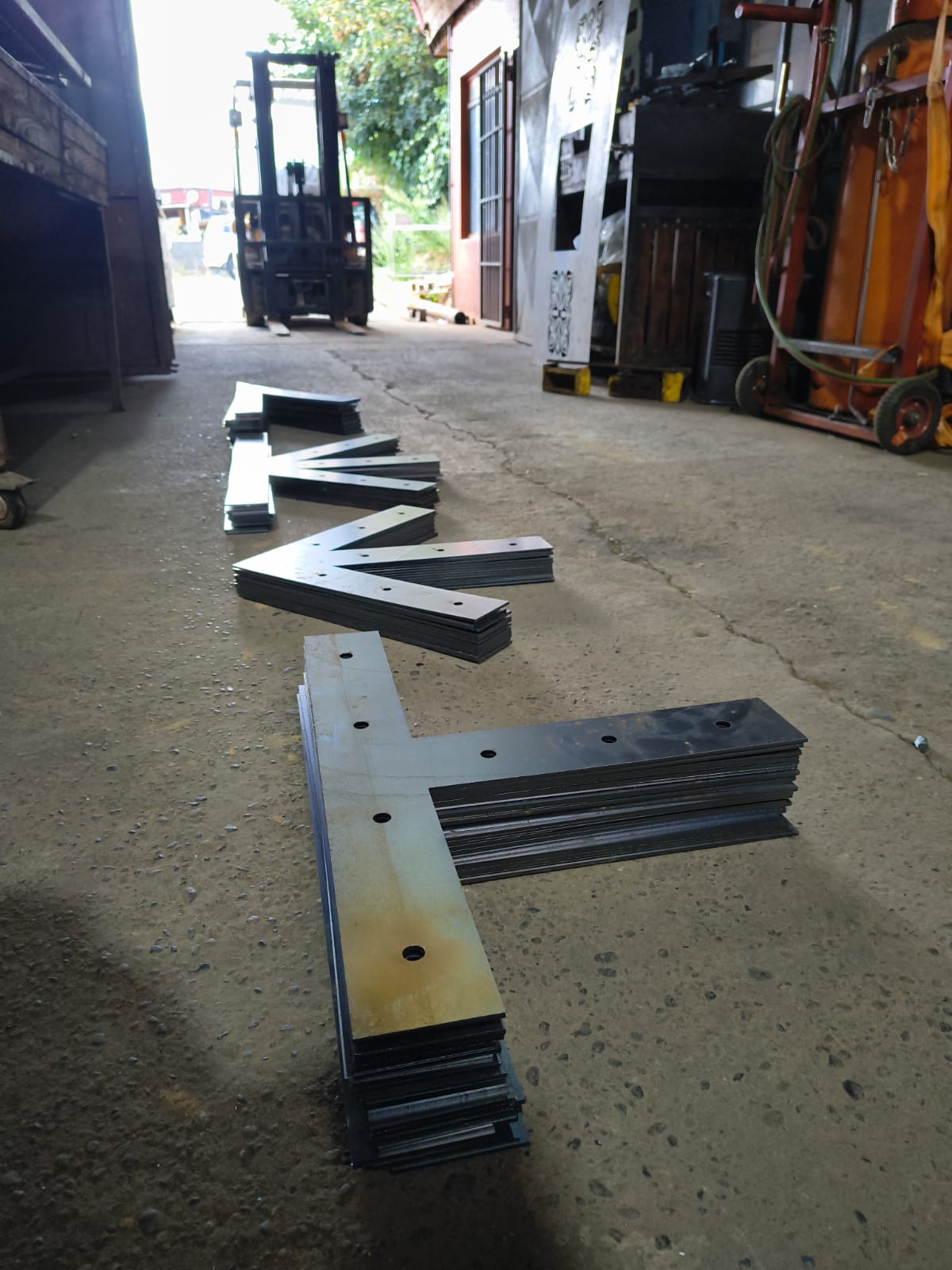 Placas de acero cortadas y perforadas, destinadas a la conformación y unión de cerchas estructurales. Cada pieza ha sido fabricada según plano, respetando dimensiones, ángulos y perforaciones necesarias para asegurar un ensamblaje preciso en obra o en taller.